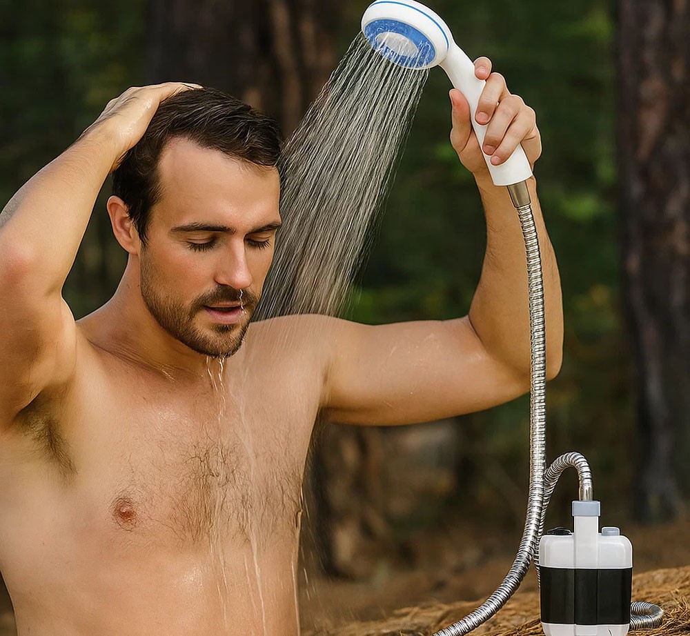 Однією з ключових переваг є вбудований насос, який працює на акумуляторі та легко заряджається за допомогою USB. Це забезпечує потужний та стійкий потік води в будь-який момент, навіть у відсутність стандартної системи водопостачання. Просто зануріть насос у заздалегідь набрану гарячу воду та активуйте його, і ви отримаєте потік гарячої води для комфортного душу. Для ввімкнення душу натисніть кнопку і затримайте її на 3-5 секунд, після чого душ почне працювати.
