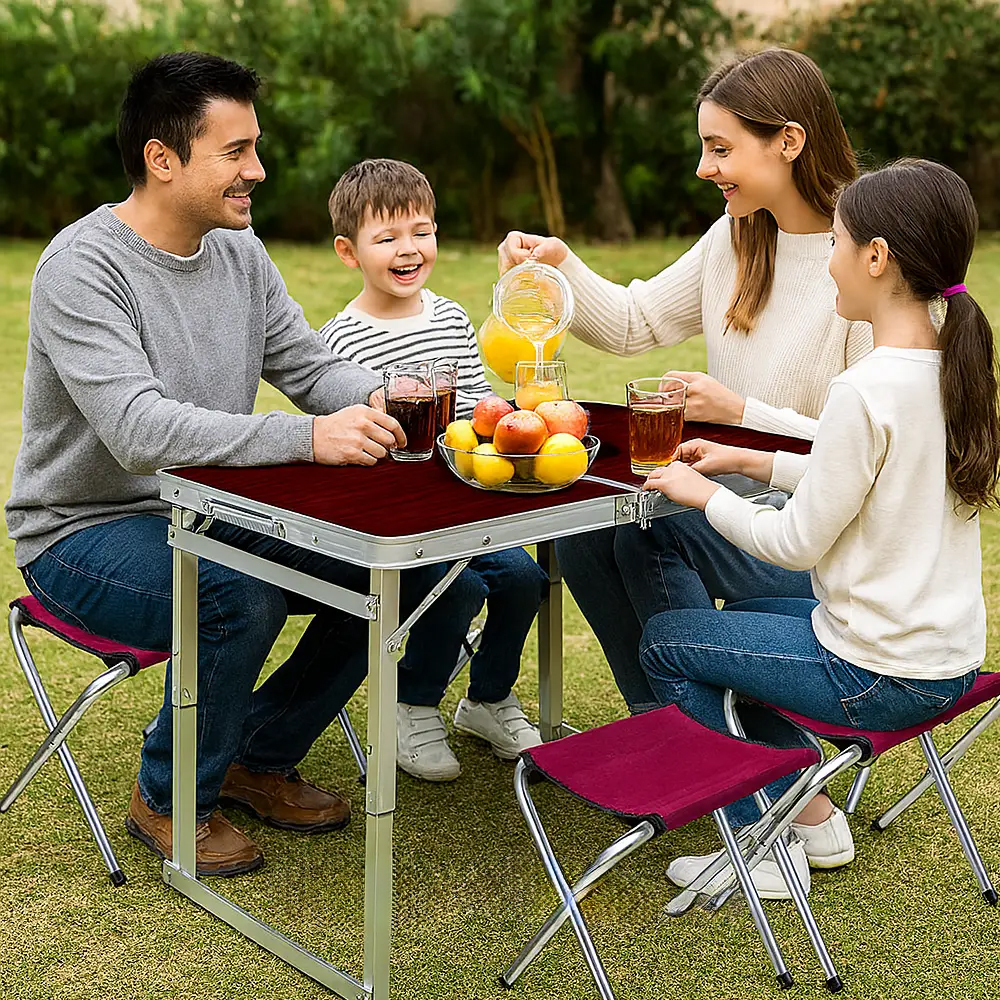 Цей складаний стіл зі стільцями - ідеальне рішення для пікніків, дачі, риболовлі та подорожей. Легкий алюмінієвий каркас і міцна ламінована стільниця забезпечують надійність і довговічність. У комплект входять чотири зручних складних стільці, які компактно прибираються всередину столу. Все легко складається у валізу з ручкою, щоб ви могли без зусиль взяти набір із собою.