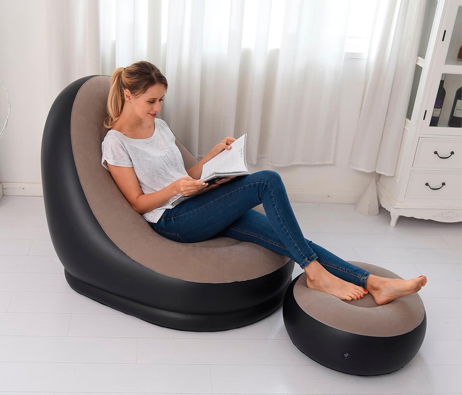 Надувний диван Air Sofa з пуфом і насосом - це ідеальний аксесуар для забезпечення комфортного відпочинку та розваг у будь-якому місці. Його мобільність та простота використання вражають. Компактні розміри (116х98х83 см) роблять його ідеальним для використання вдома, на пікніку, на пляжі або під час кемпінгу. Завдяки ергономічній формі, він забезпечує розслаблене положення спини.