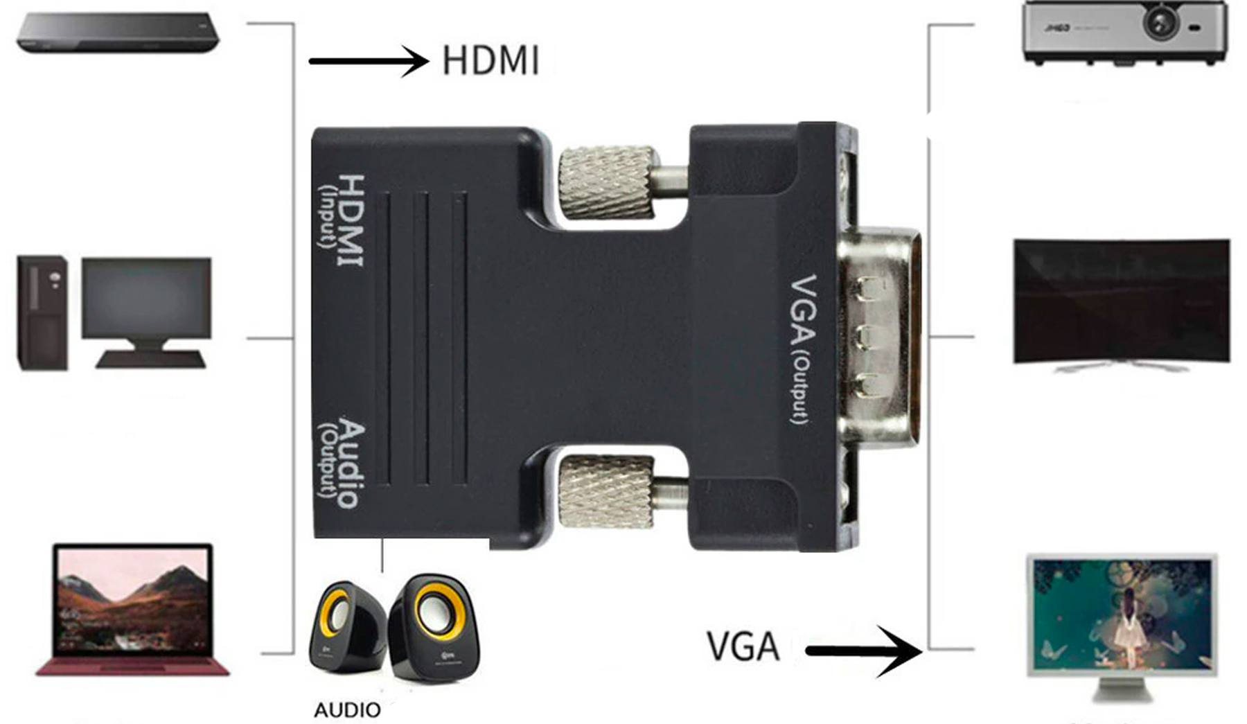 Перехідник hdmi vga може бути використаний у ноутбуках, проекторах, моніторах, планшетних ПК та інших HD пристроях. Перетворює цифровий відео- та аудіосигнал HDMI на аналоговий інтерфейс VGA. Перетворювач дозволяє отримувати звук з джерела HDMI через 3.5 мм джек. Не може використовуватися як перехідник із VGA на HDMI, працює в одну сторону.