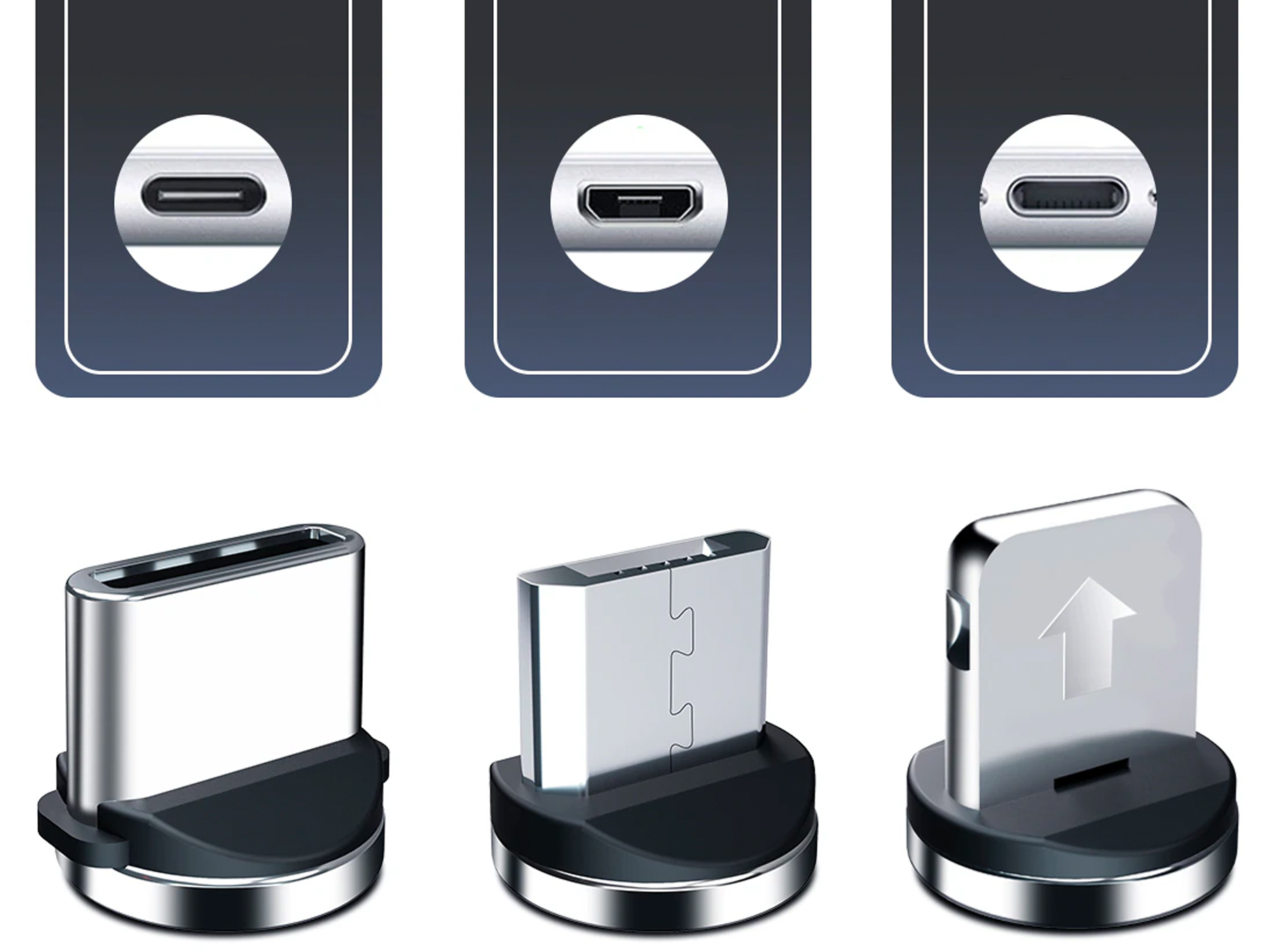 Магнітний кабель для зарядки оснащений роз'ємами Type-C, Micro USB і Lightning, що дозволяє використовувати його з більшістю сучасних смартфонів і планшетів. Кабель виготовлений із високоякісних матеріалів, що робить його міцним та довговічним. Він спроектований для витримування повсякденного використання та вигинів без втрати функціональності.